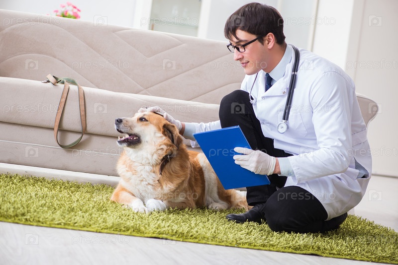 Ветеринар осматривает золотого ретривера собака на домашнем посещении