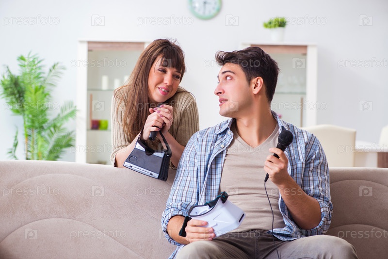 Пара, поющая караоке с очками виртуальной реальности