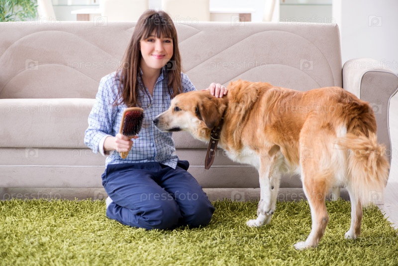 Счастливая женщина-хозяин собаки дома с золотым ретривером