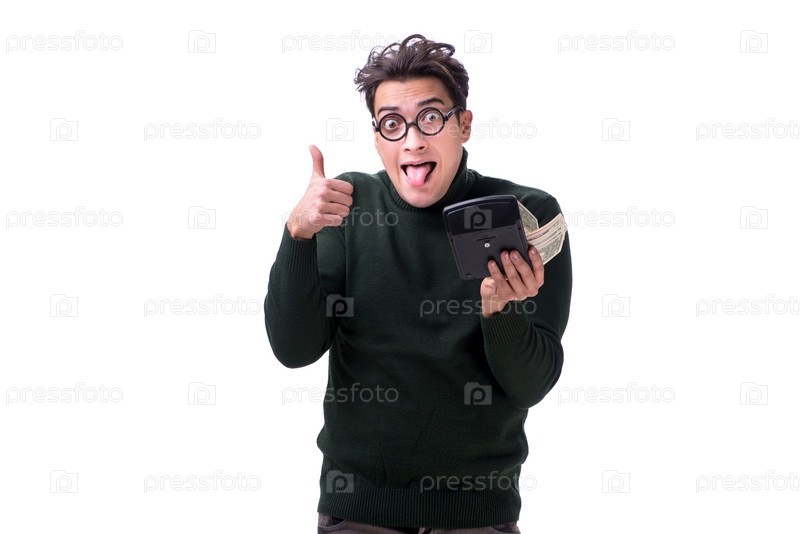 Нэрд молодой человек с калькулятором, изолированный на белом