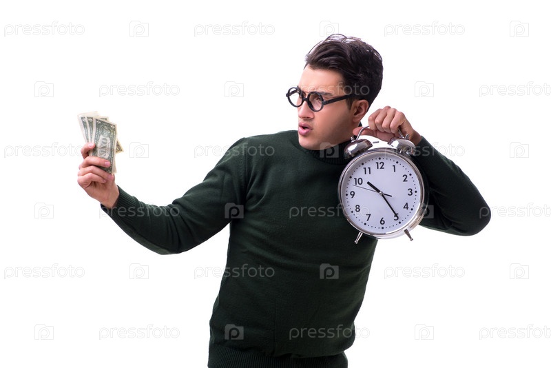 Нерд молодой человек с часами и деньгами, изолированными на белом