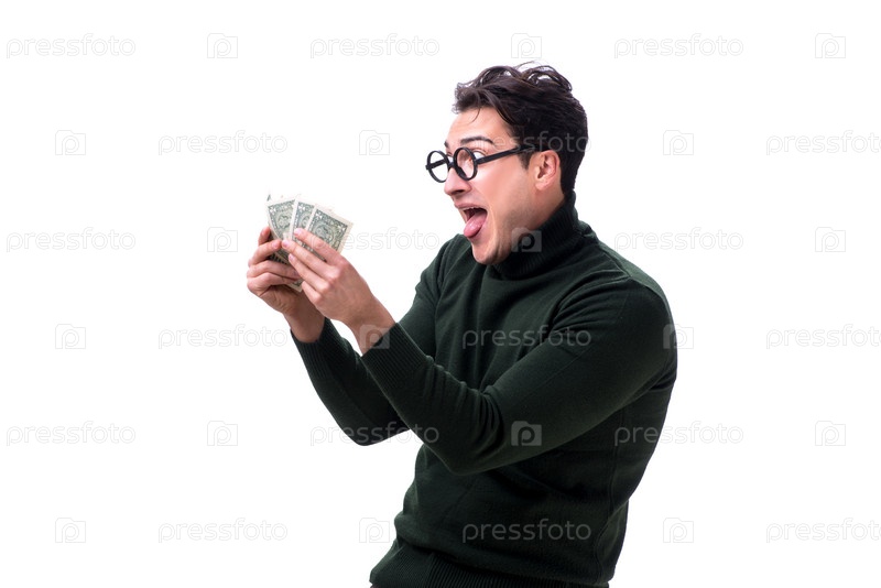 Молодой человек с деньгами изолирован на белом