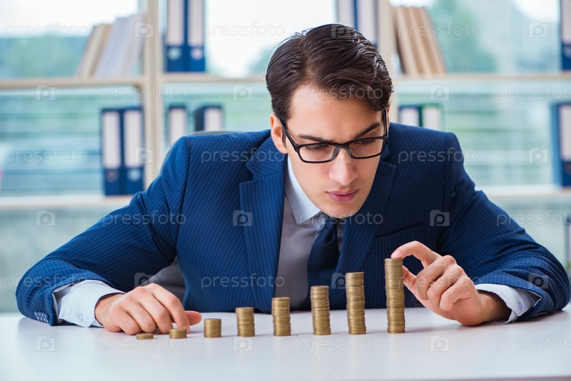 Бизнесмен с кучей монет в офисе