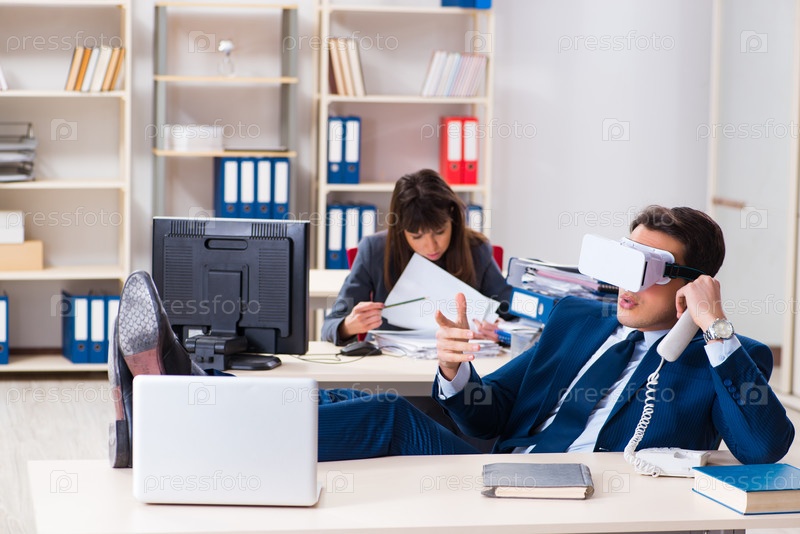 Сотрудник с очками виртуальной реальности в офисе