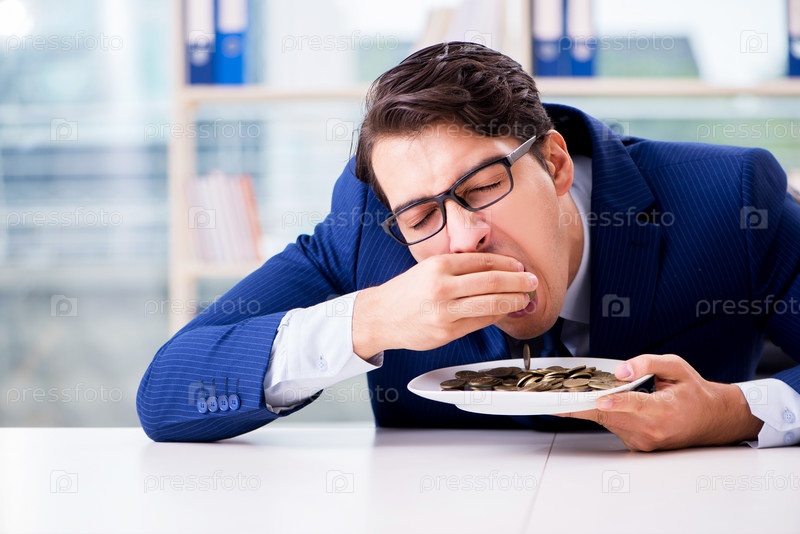 Забавный бизнесмен ест золотые монеты в офисе