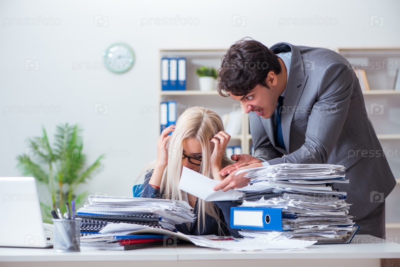 Разгневанный сердитый босс кричит и кричит на свою секретарь-работницу