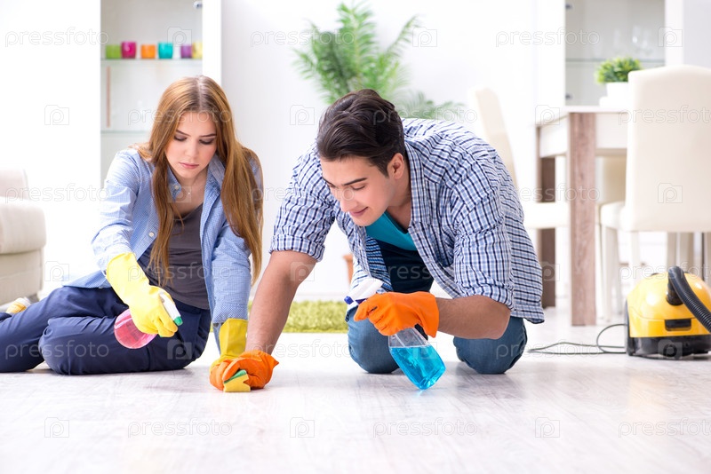 Молодая семья убирает дом