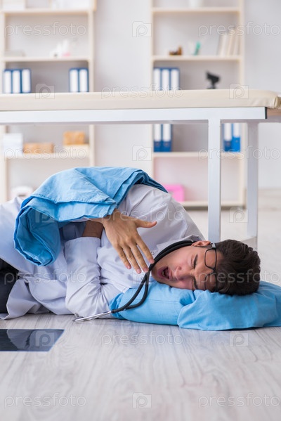 Доктор спит на полу после долгой ночной смены