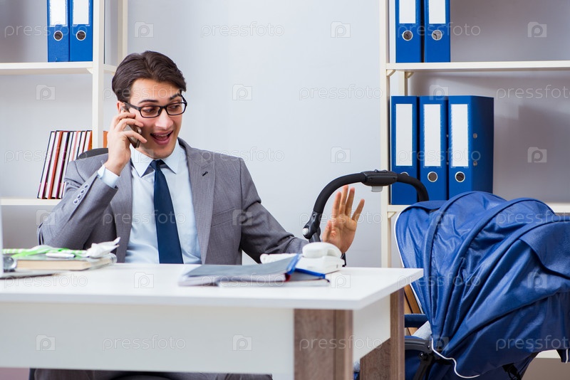 Бизнесмен ухаживает за новорожденным ребенком в офисе
