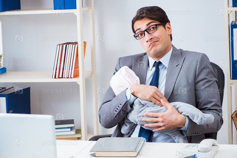 Бизнесмен ухаживает за новорожденным ребенком в офисе