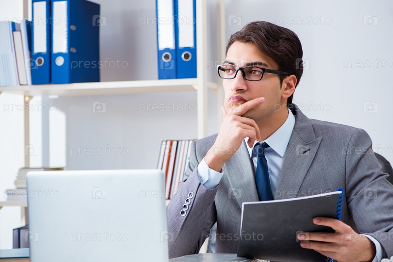 Молодой привлекательный бизнесмен-сотрудник, работающий в офисе за столом