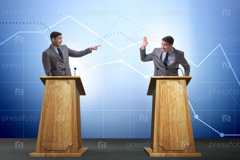Бизнесмен выступает с речью на трибуне в бизнес-концепции