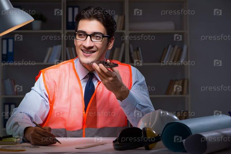 Строительный архитектор работает над чертежами поздно ночью