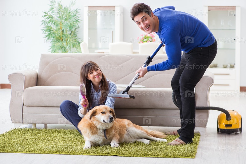 Муж убирает дом из собачьего меха