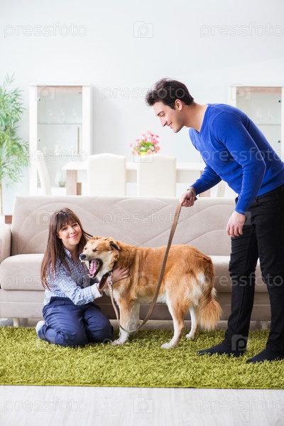 Счастливая семья с собакой золотого ретривера