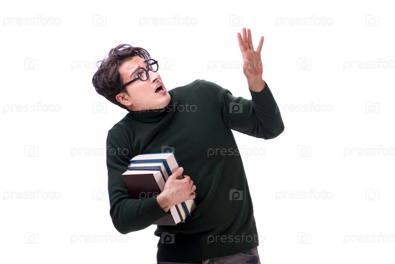 Нерд молодой студент с книгами, изолированными на белом