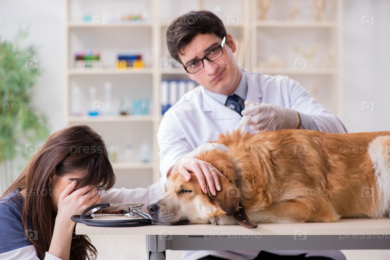 Врач и его помощник проверяют золотого ретривера в клинике ветеринара