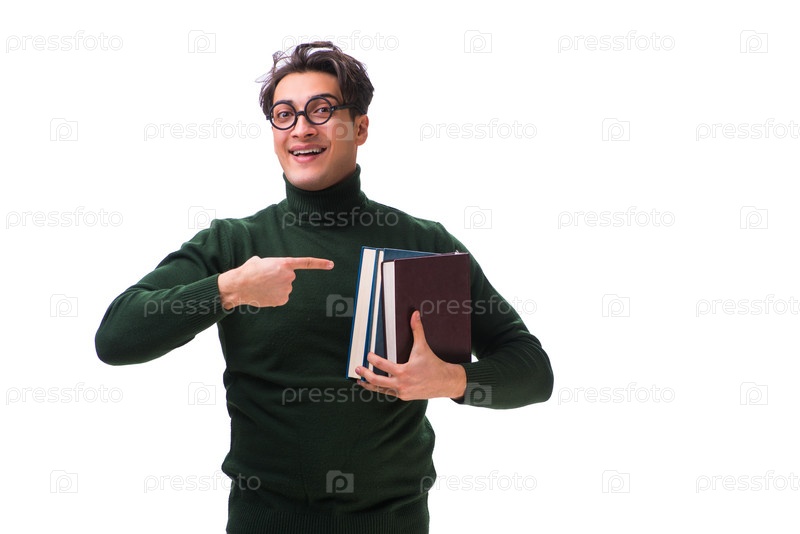 Нерд молодой студент с книгами, изолированными на белом