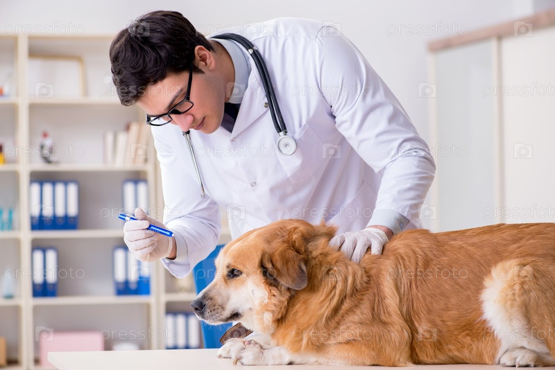 Врач осматривает собаку золотого ретривера в ветеринарной клинике