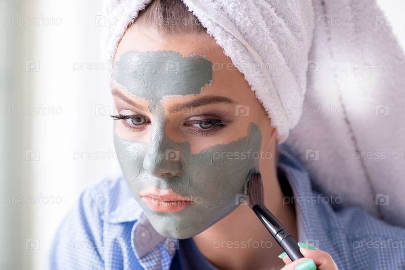 Женщина наносит глиняную маску с помощью кисти дома