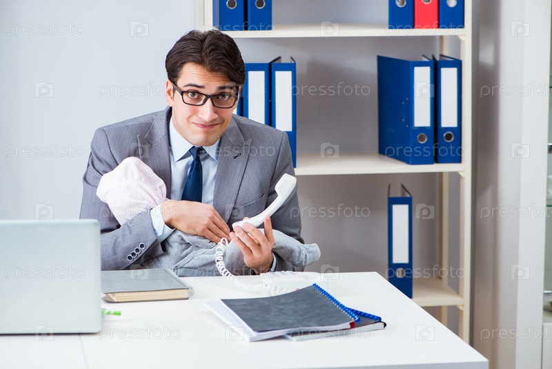 Бизнесмен ухаживает за новорожденным ребенком в офисе