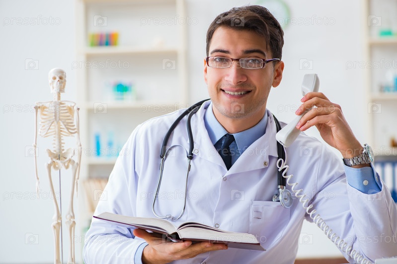 Студент-доктор изучает кости скелета
