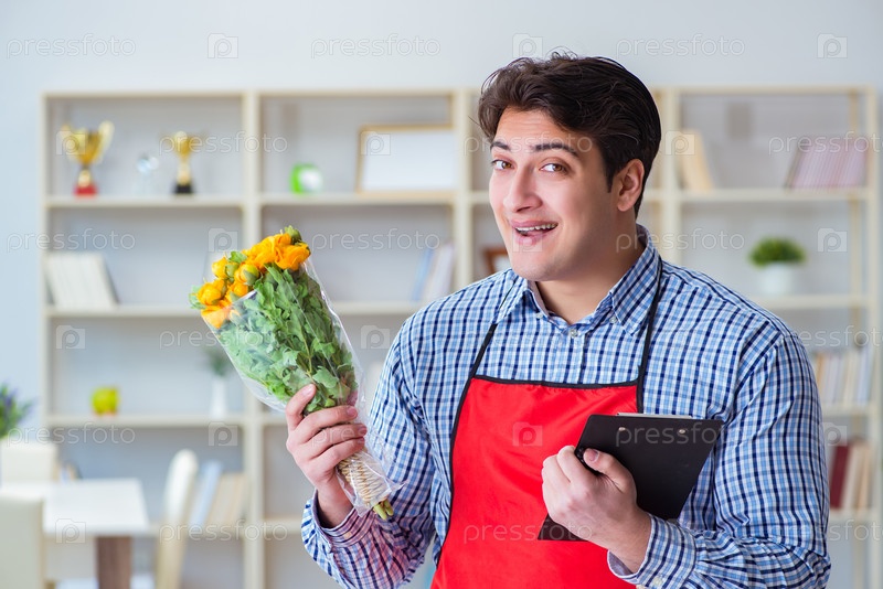 Помощник цветочного магазина, предлагающий букет цветов