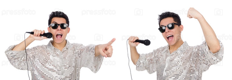Белый мужчина с микрофоном, изолированным на белом