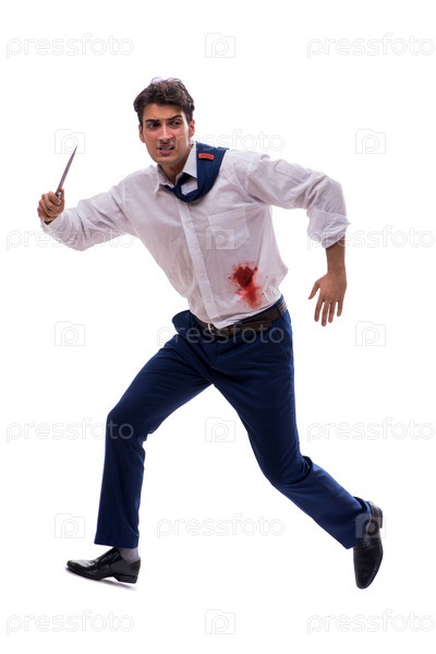 Раненый бизнесмен с пятнами крови изолирован на белом фоне
