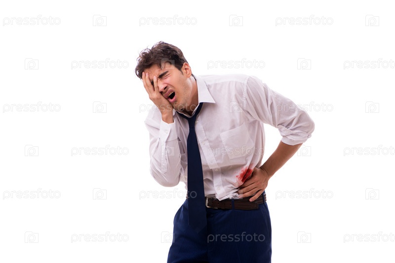 Раненый бизнесмен с пятнами крови изолирован на белом фоне