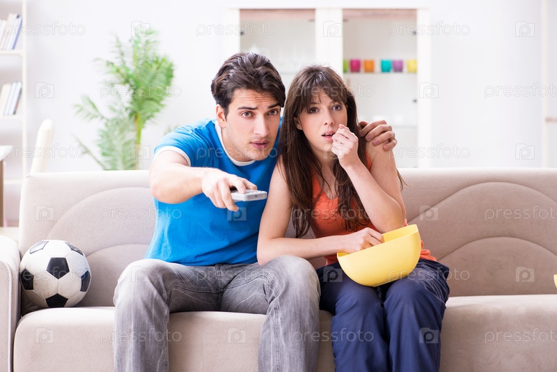 Молодой человек смотрит футбол со своей женой дома
