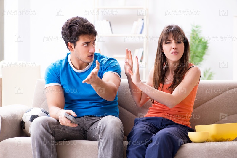 Молодой человек смотрит футбол со своей женой дома