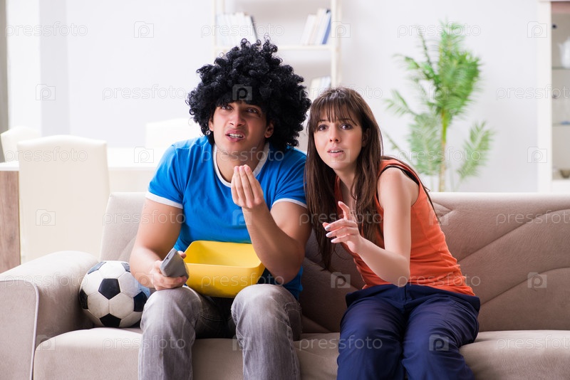 Молодой человек смотрит футбол со своей женой дома