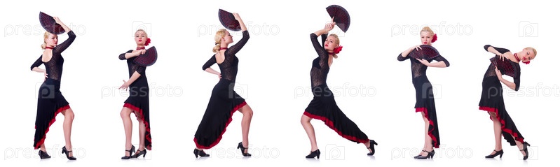 Женщина танцует испанский танец изолированно на белом