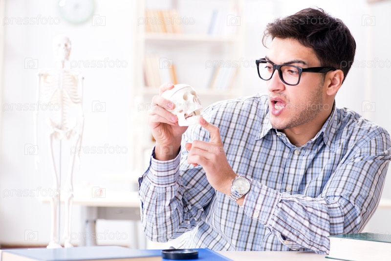 Студент-медик изучает скелет