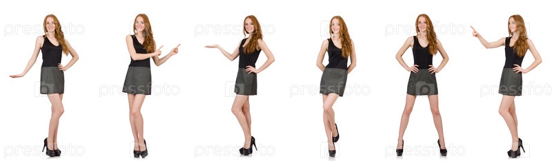 Красноволосая девушка в сером платье изолирована на белом