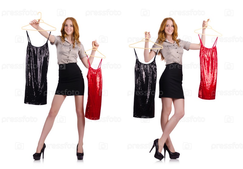 Женщина выбирает платье, изолированное на белом