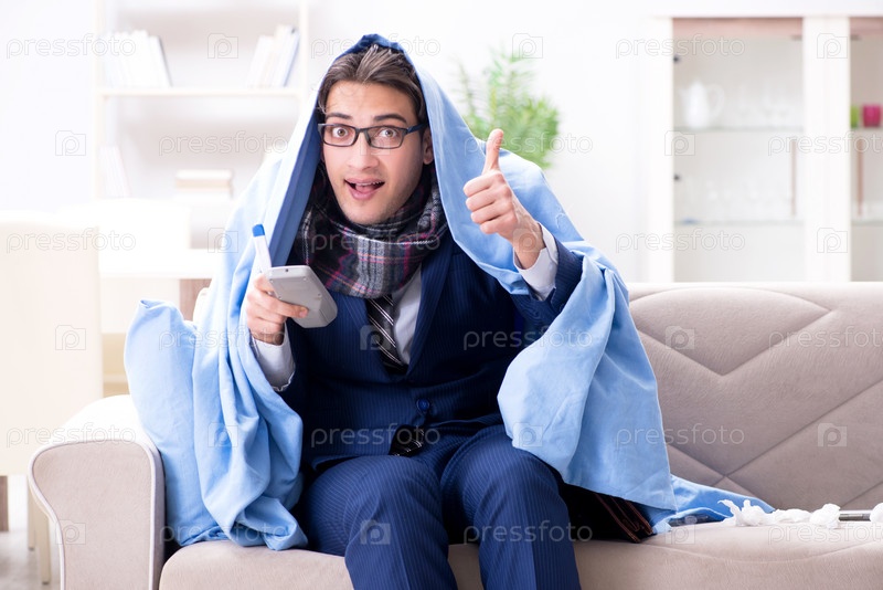 Работник бизнесмена смотрит телевизор, когда болен гриппом
