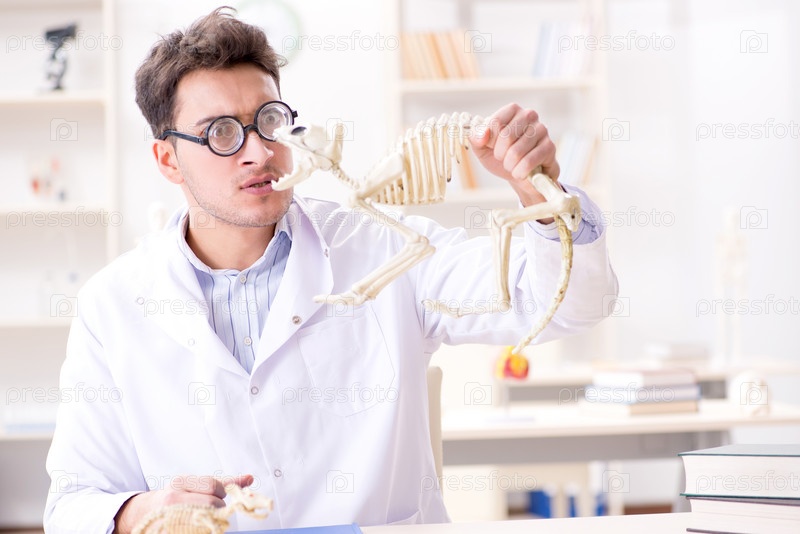 Забавный сумасшедший студент-врач изучает скелет животного