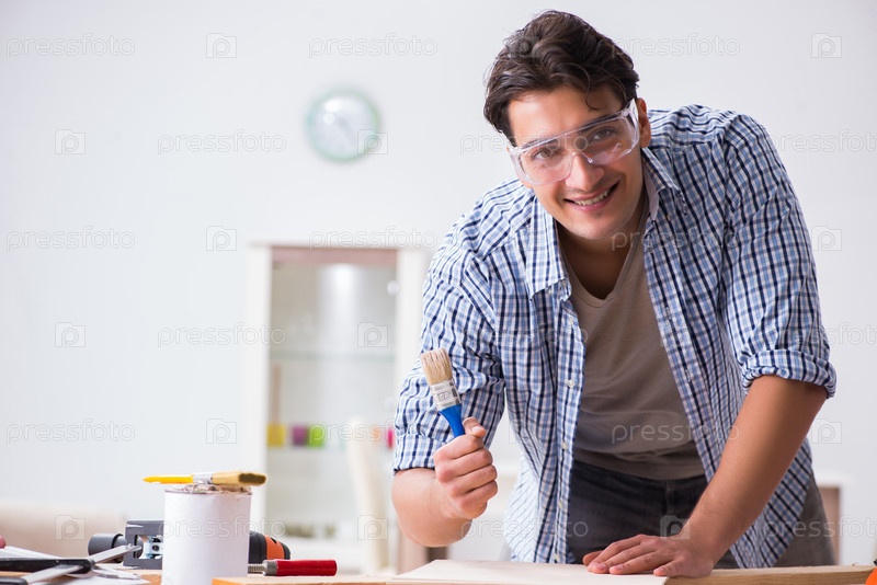 Молодой человек в концепции хобби деревообработки