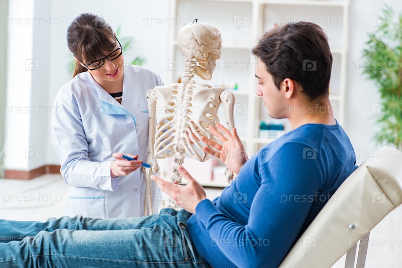 Врач показывает пациенту тип травмы на скелете