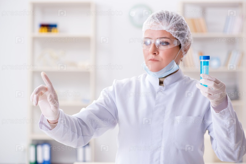 Женщина-химик нажимает виртуальную кнопку в лаборатории