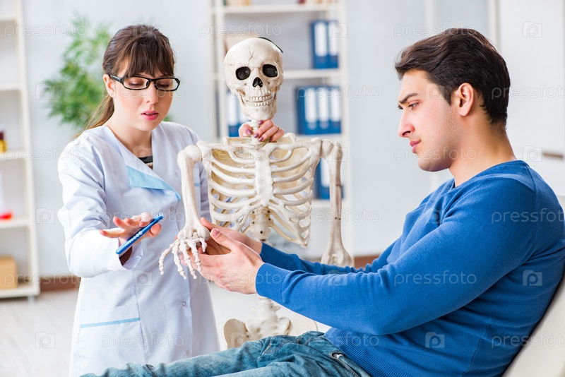 Врач показывает пациенту тип травмы на скелете