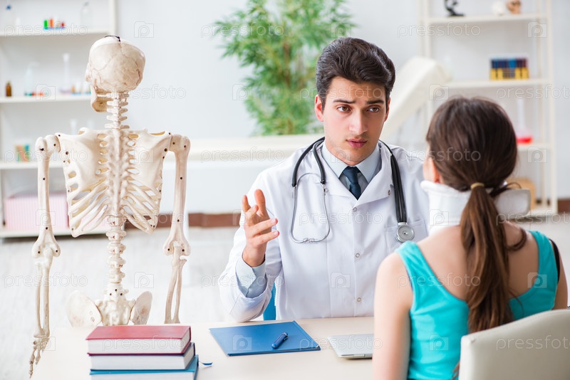 Врач объясняет пациенту с травмой шеи