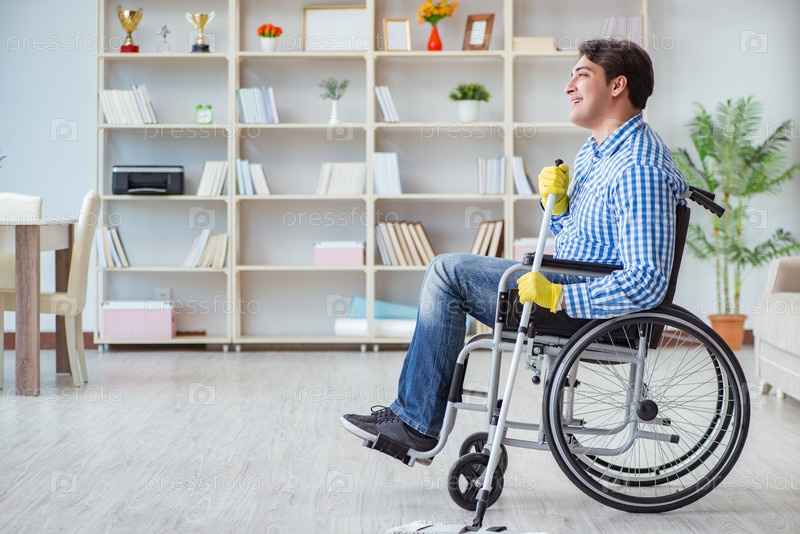 Инвалид на инвалидной коляске убирает дом