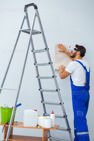 Мужчина с очками VR наклеивает обои