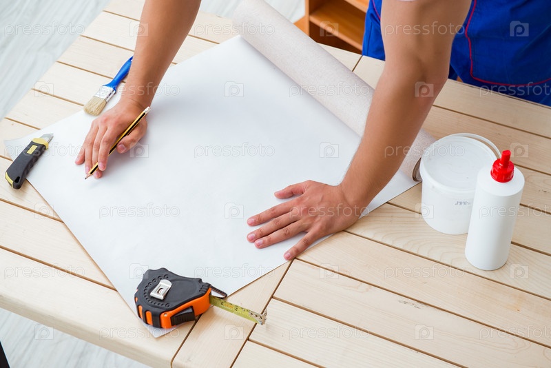 Работник, работающий на обоях во время ремонта