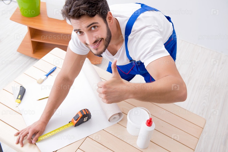 Работник, работающий на обоях во время ремонта
