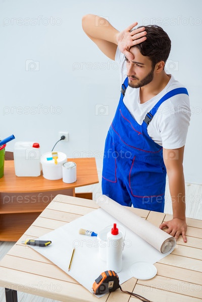 Работник, работающий на обоях во время ремонта