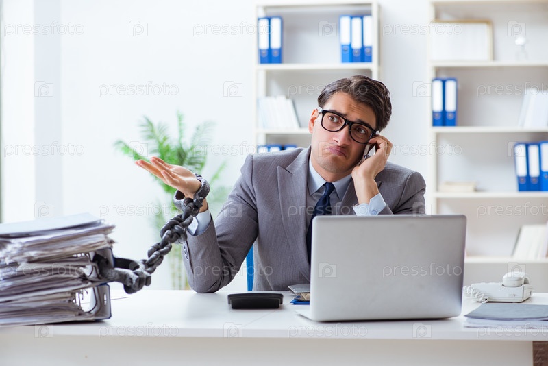 Загруженный сотрудник прикован цепями к своему офисному столу